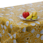 Bergen Mustard Scandi Matt Wipe Clean Oilcloth Tablecloth. Drawing inspiration from Scandinavian geometrics, the Bergen Mustard Scandi oilcloth tablecloth features a repeating pattern of stylised leaves and petals in a warm mustard hue on a crisp white background. The balanced, symmetrical design has a retro feel yet remains contemporary, making it a versatile choice for both minimalist and eclectic interiors. Like all Justwipe oilcloths, it is made from 100 % cotton fabric coated with a family‑safe, phthalate‑free PVC finish. This coating creates a waterproof, wipe‑clean surface that protects your table from spills, paint and crumbs while still draping nicely.