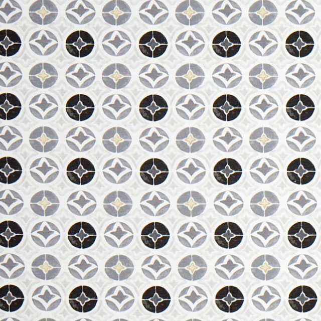 This beautiful wipe clean oilcloth shows  grey, beige and black shapes on a white background and is an eye catching addition to any tabletop whilst also protecting it from spills and mess.