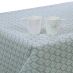 A beautiful white leaf design against a pale blue background. This very classy oilcloth issure to brighten up your dining space.