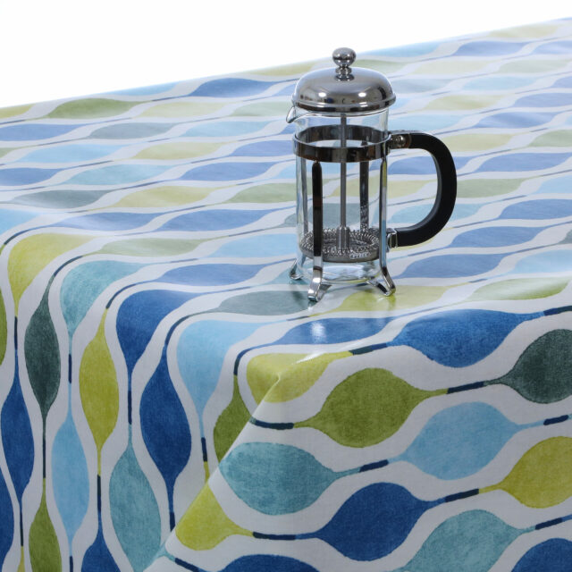 Add a touch of class and sophistication to your dining table with this modern looking luxury oilcloth tablecloth. With its blue and green shapes it is a stunning and functional way to enhance your dining experience.