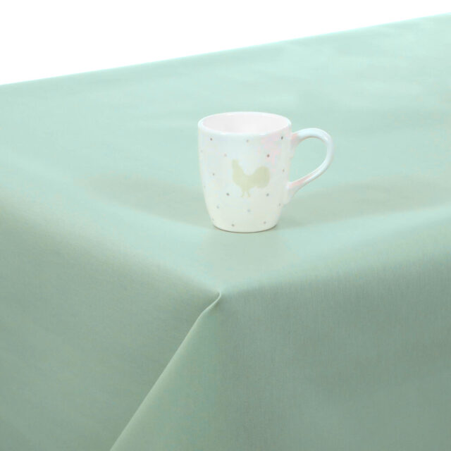 All our oilcloths are easy to look after, do not need to be laundered – they just wipe clean and protect your tabletop from spills and mess. Made from 100% cotton fabric, this Regency Duckegg Plain Matt Wipe Clean Oilcloth Tablecloth is coated in the UK with child friendly phthalate free coatings. Approx 132cms wide.